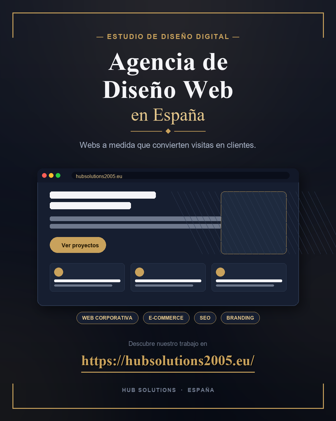 En Hub Solutions 2005 somos una agencia de diseño web especializada en pymes de Toledo, Madrid y toda España. Trabajamos con transparencia, SEO integrado, tecnología estándar (WordPress) y soporte real post-lanzamiento. No somos la agencia más barata, pero sí la que más rentabilidad ofrece a largo plazo a nuestros clientes.